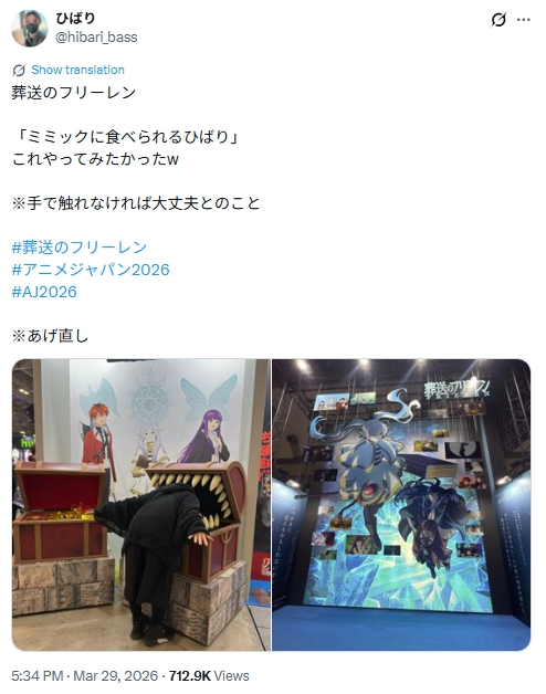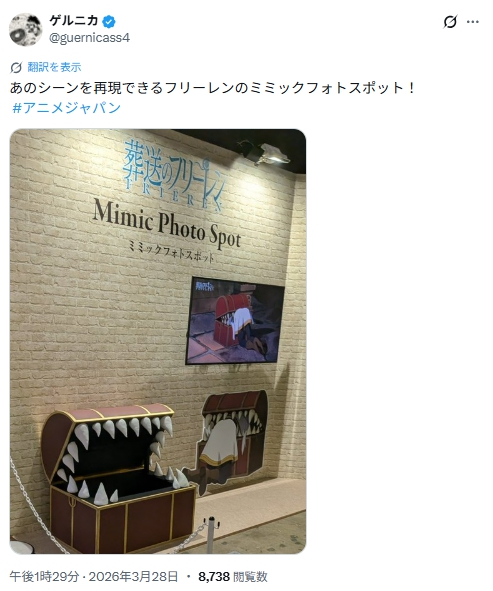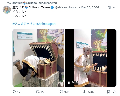 鹿乃つのさんが、「葬送のフリーレン」ブースでミミックの展示物との写真をXで投稿したところ、視聴者から批判の声が相次ぎ炎上しています。