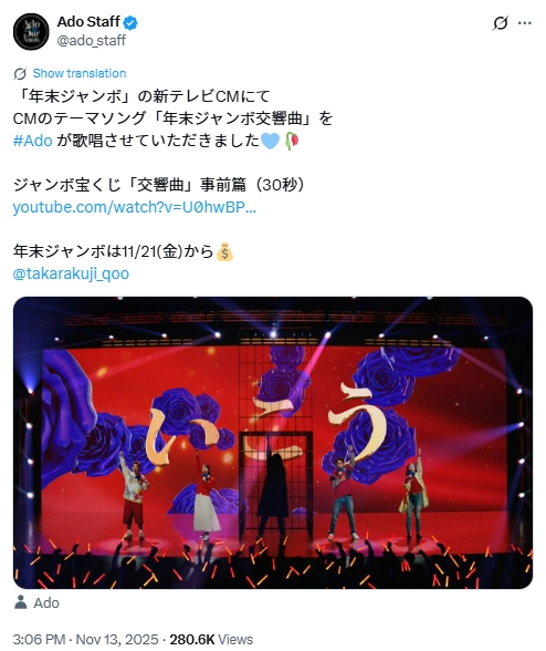 テレビで宝くじのCMみてたらado顔出してたね