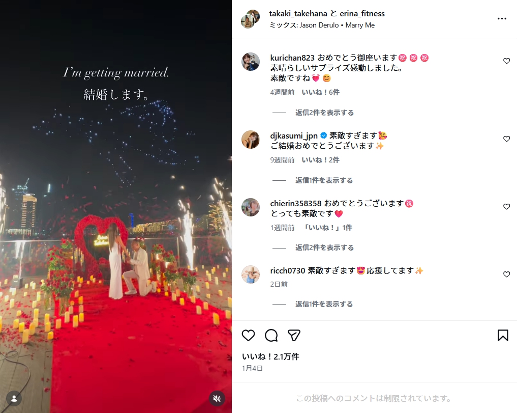 2026年1月には、竹花貴騎さんとERENAさんとともにSNSを通じて結婚発表があり、周囲を驚かせました。