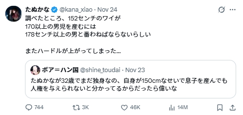 たぬかなさんは過去に、身長178㎝以上の男との結婚を匂わせしています。