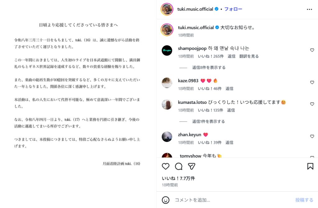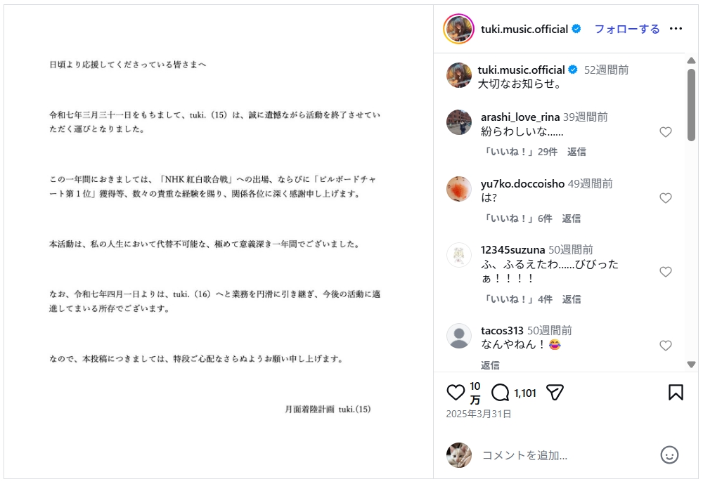 2026年3月31日、覆面JKシンガーソングライターのtuki.さんは、XやInstagramなどのSNSで「日頃より応援してくださっている皆さまへ」と題した投稿をしました。