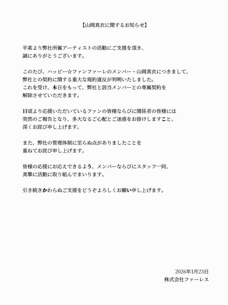 山岡真衣の規約違反の謝罪文は、1月23日公開の映画『恋愛裁判』に合わせた映画のネタ(広報)です。山岡真衣は『恋愛裁判』の主人公名で、ハッピーファンファーレというグループも存在しません。山岡真衣役は元日向坂46の斎藤京子さんで、恋愛をして事務所から訴えられて裁判に立つという社会問題ともいえる役柄を演じています。