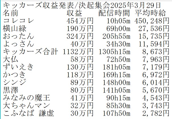 2025年3月29日には決起集会が行われ、キッカーズグループ内で1,000万円以上の収益があったと報告されていました。
