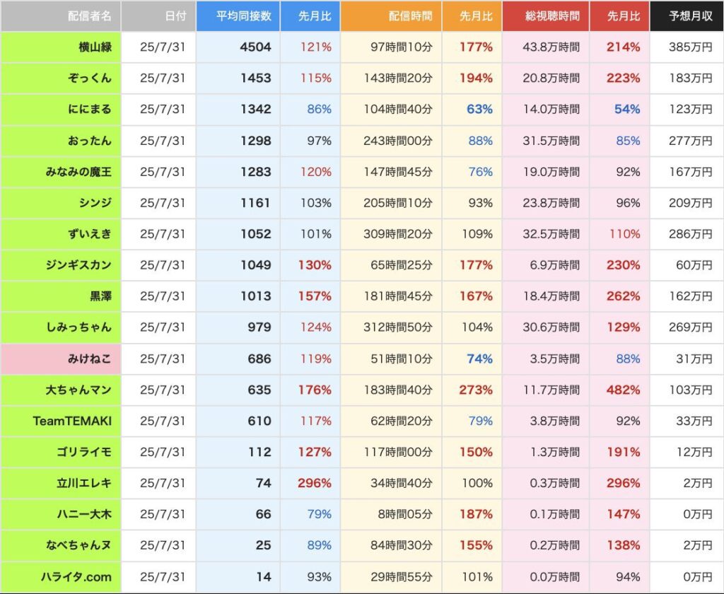 横山緑さん率いるKick配信者グループは、データ管理をするものもいるようで、数字が公開されています。