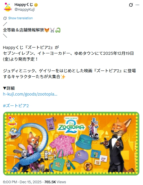 2025年12月16日、セブン系列店でズートピアのHappyくじ「ズートピア2」が発売されました。