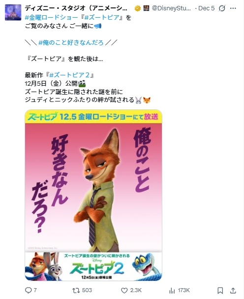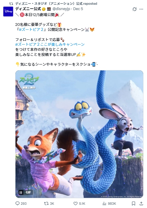 2025年12月5日、ディズニーの大ヒット映画の続編「ズートピア2」が封切られ話題になっています。